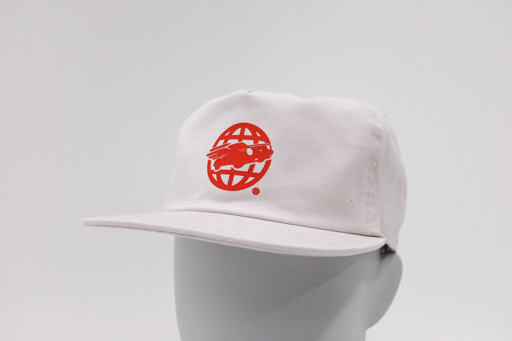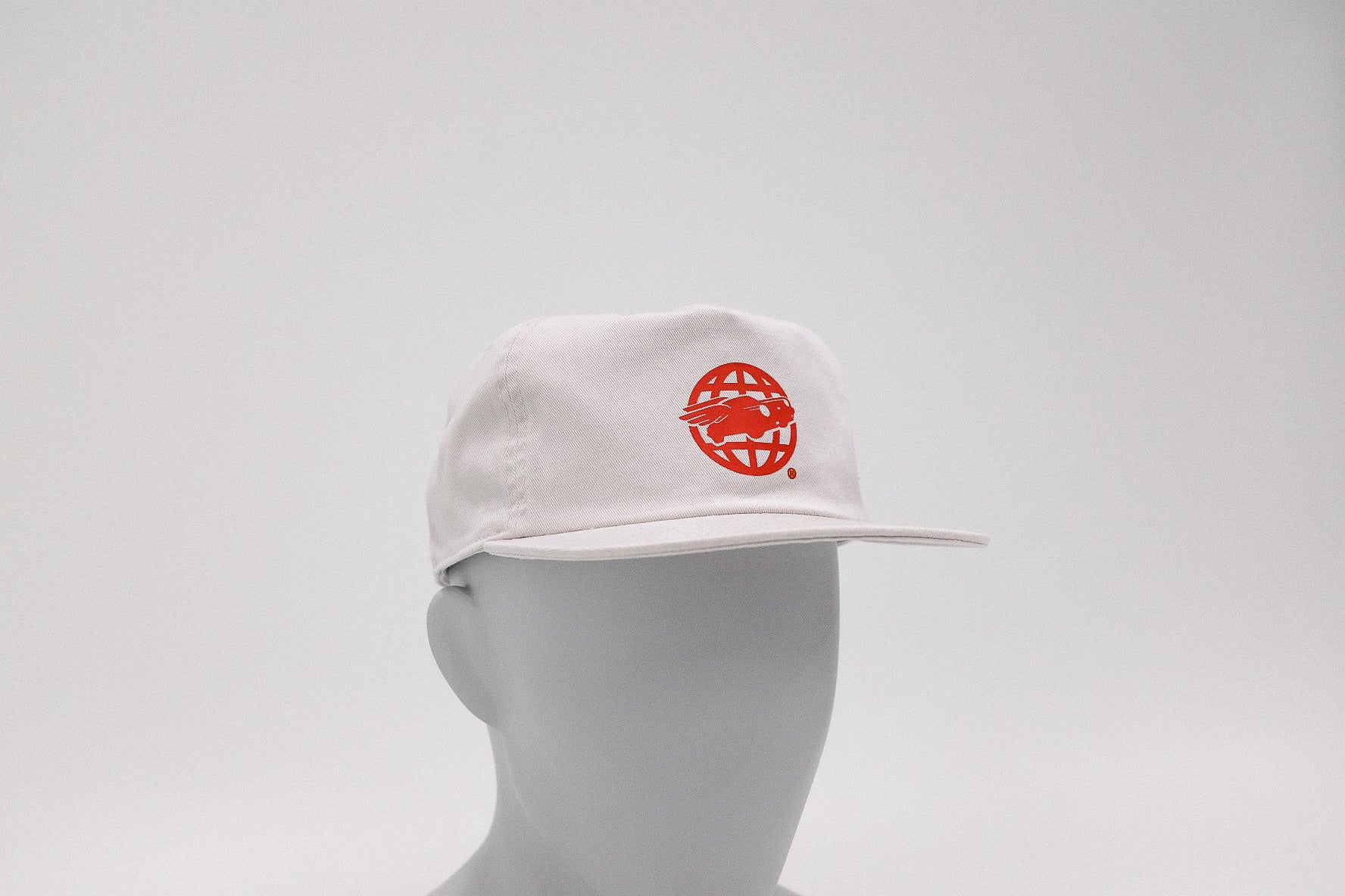 The Meridian 5 Panel Cap in Ivory, featuring the winged flat-six icon in Guards Red.